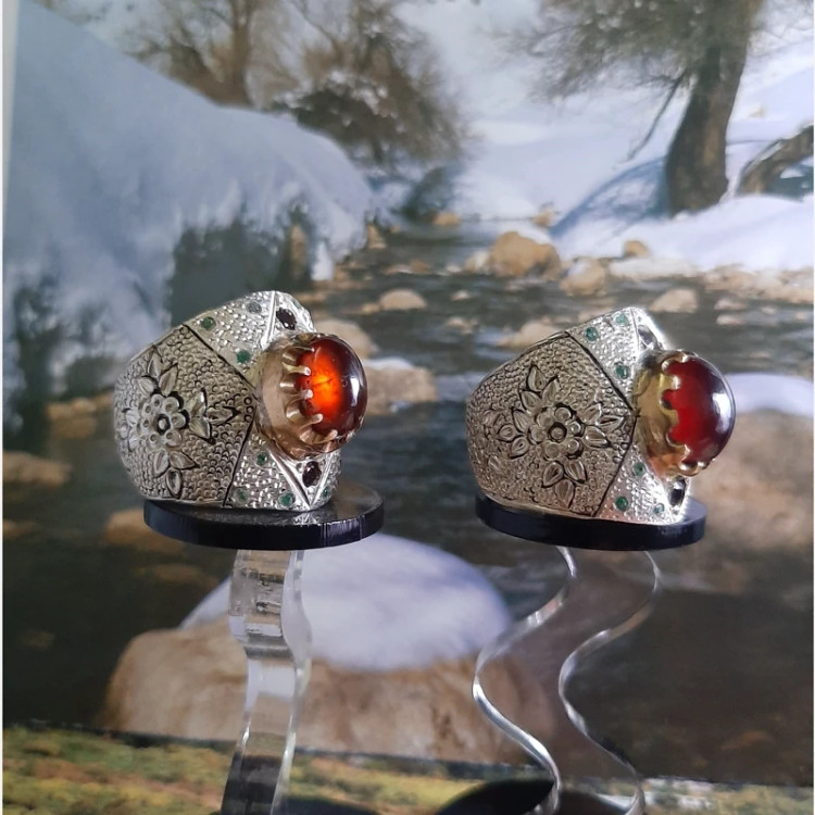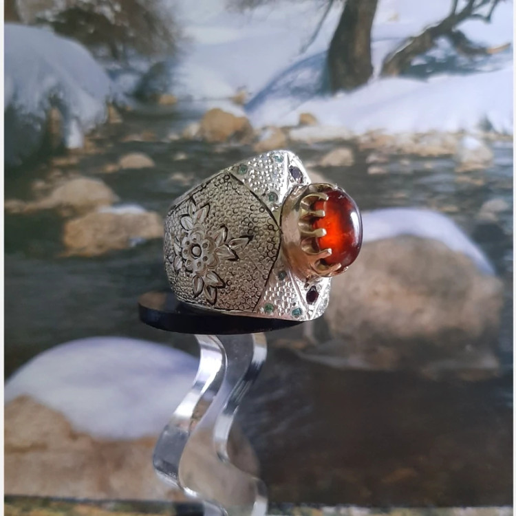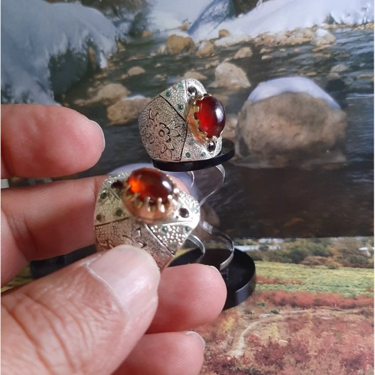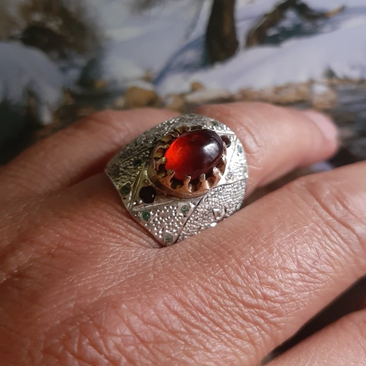 انگشتر نقره دستساز با نگین یاقوت طبیعی گارنت قلمکاری دست مخراجکاری زمرد طبیعی سایز 62 وزن 20 گرم و نیم عیار 925