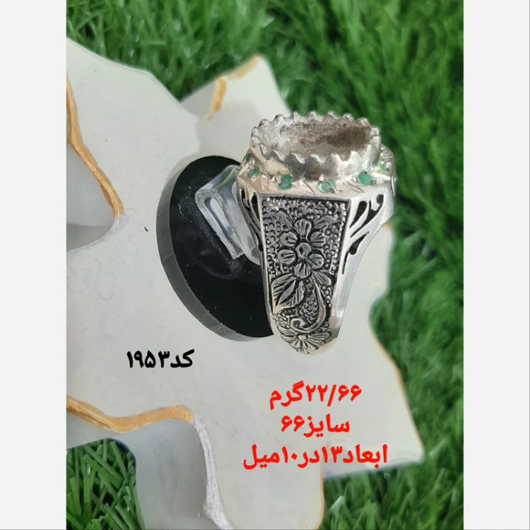 رکاب انگشتر دست ساز مردانه نقره 925 با مخراجکاری سنگ زمرد طبیعی قلمکاری دست به روش سنتی رکاب کاملا دست ساز با مهر مغان وزن 22 گرم و نیم سایز 66 ابعاد نگین 13 در 10 میلیمتر