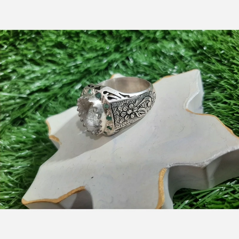 رکاب انگشتر دست ساز مردانه نقره 925 با مخراجکاری سنگ زمرد طبیعی قلمکاری دست به روش سنتی رکاب کاملا دست ساز با مهر مغان وزن 22 گرم و نیم سایز 66 ابعاد نگین 13 در 10 میلیمتر