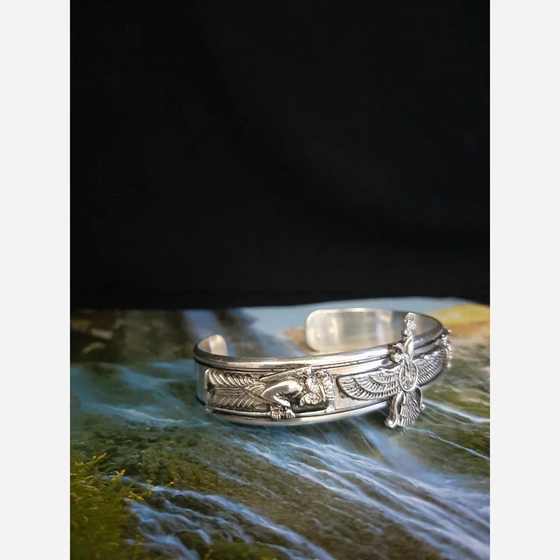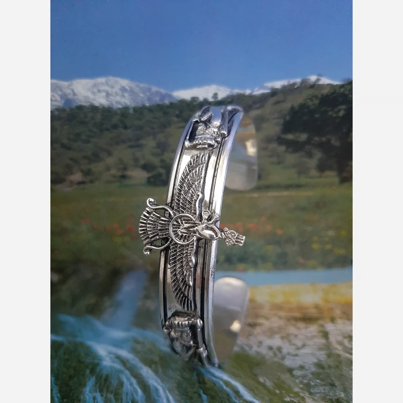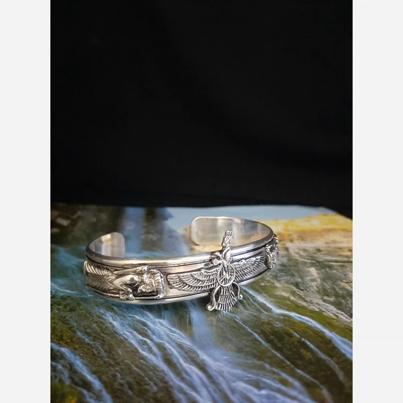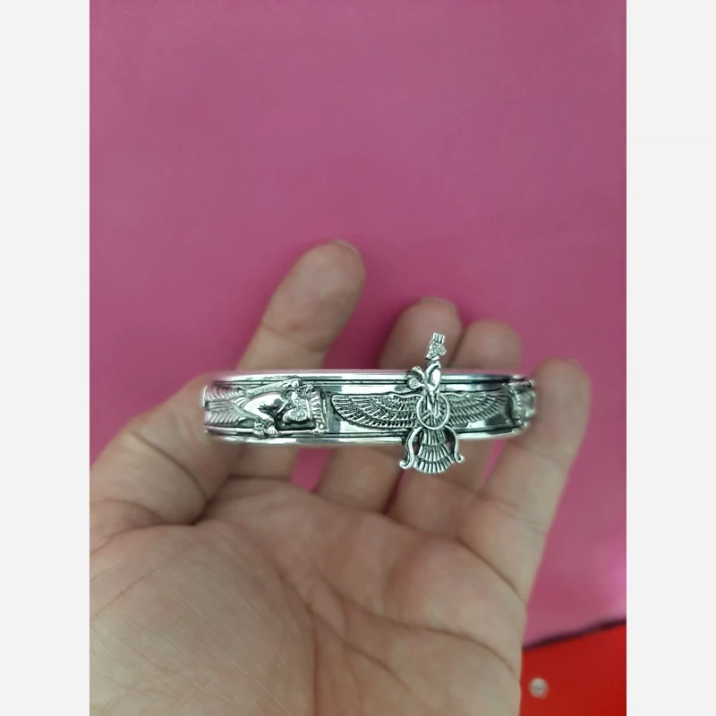 دستبند نقره یا خالخال نقره پالهنگ نقره عیار 925 وزن حدود 43 گرم پهنا یک سانت و نیم طرح فروهر و سرباز هخامنشی