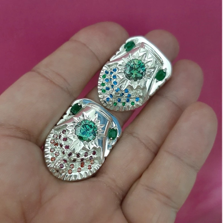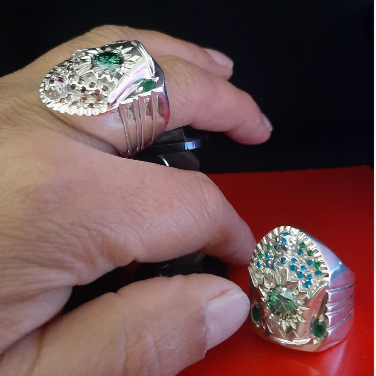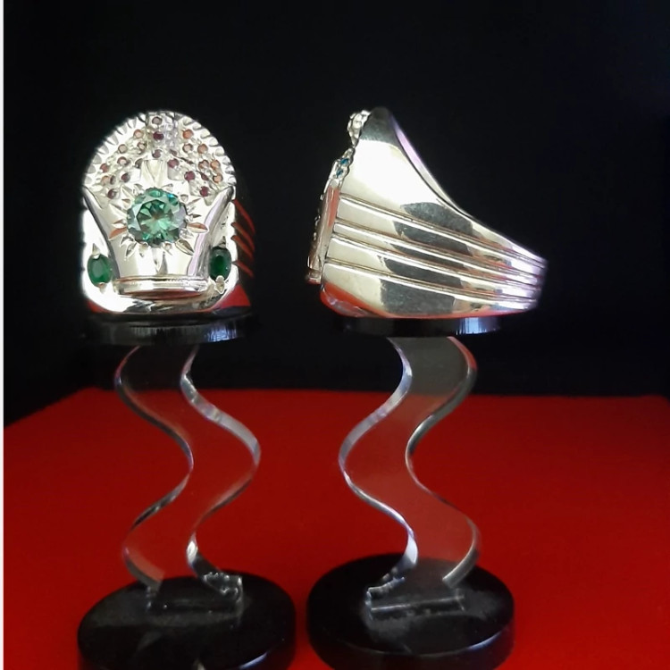 انگشتر تمام نقره با تک نگین موزانایت و مخراج یاقوت و زمرد وزن هر کدام 58 الی 58 گرم و نیم سایز 66 عیار 925