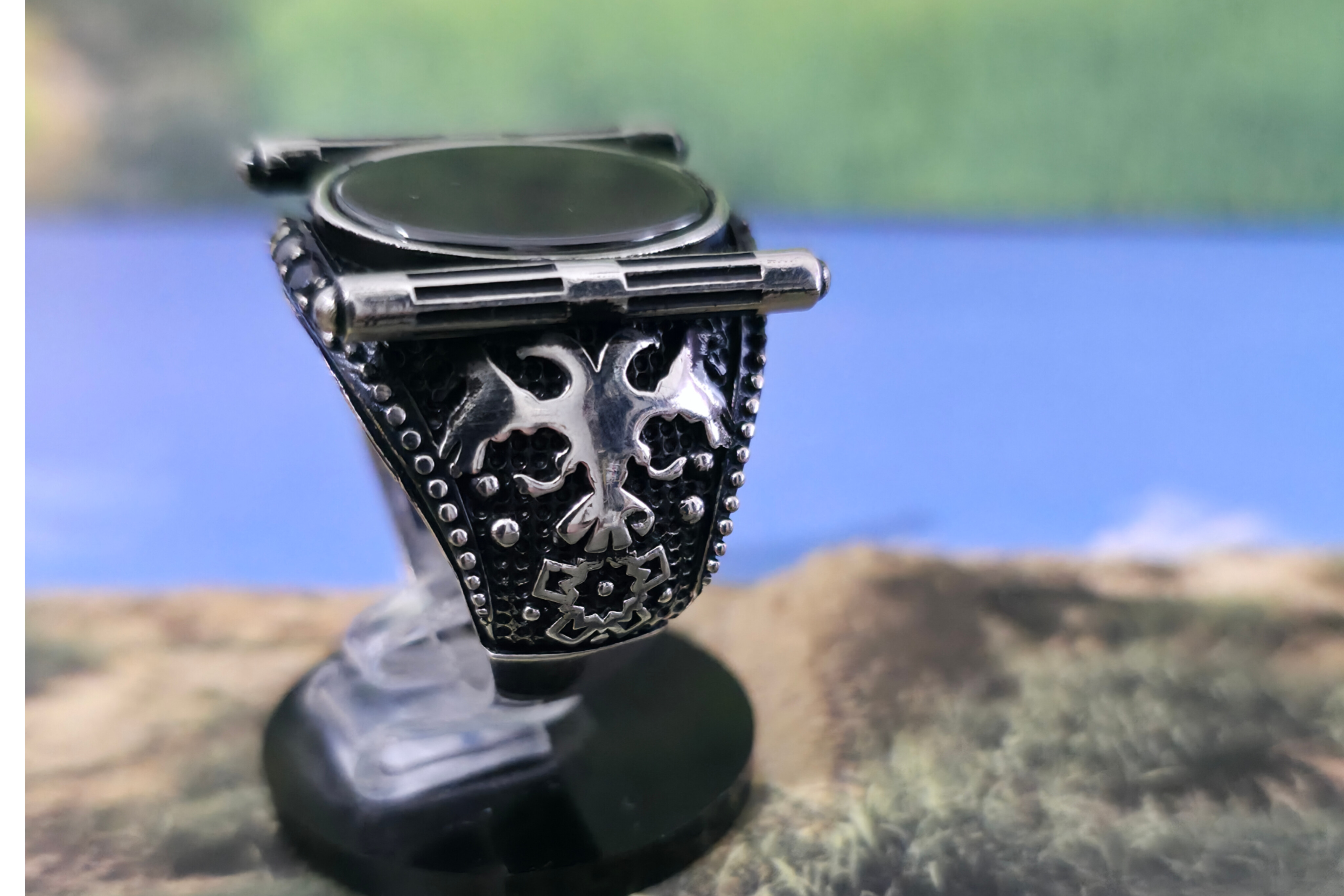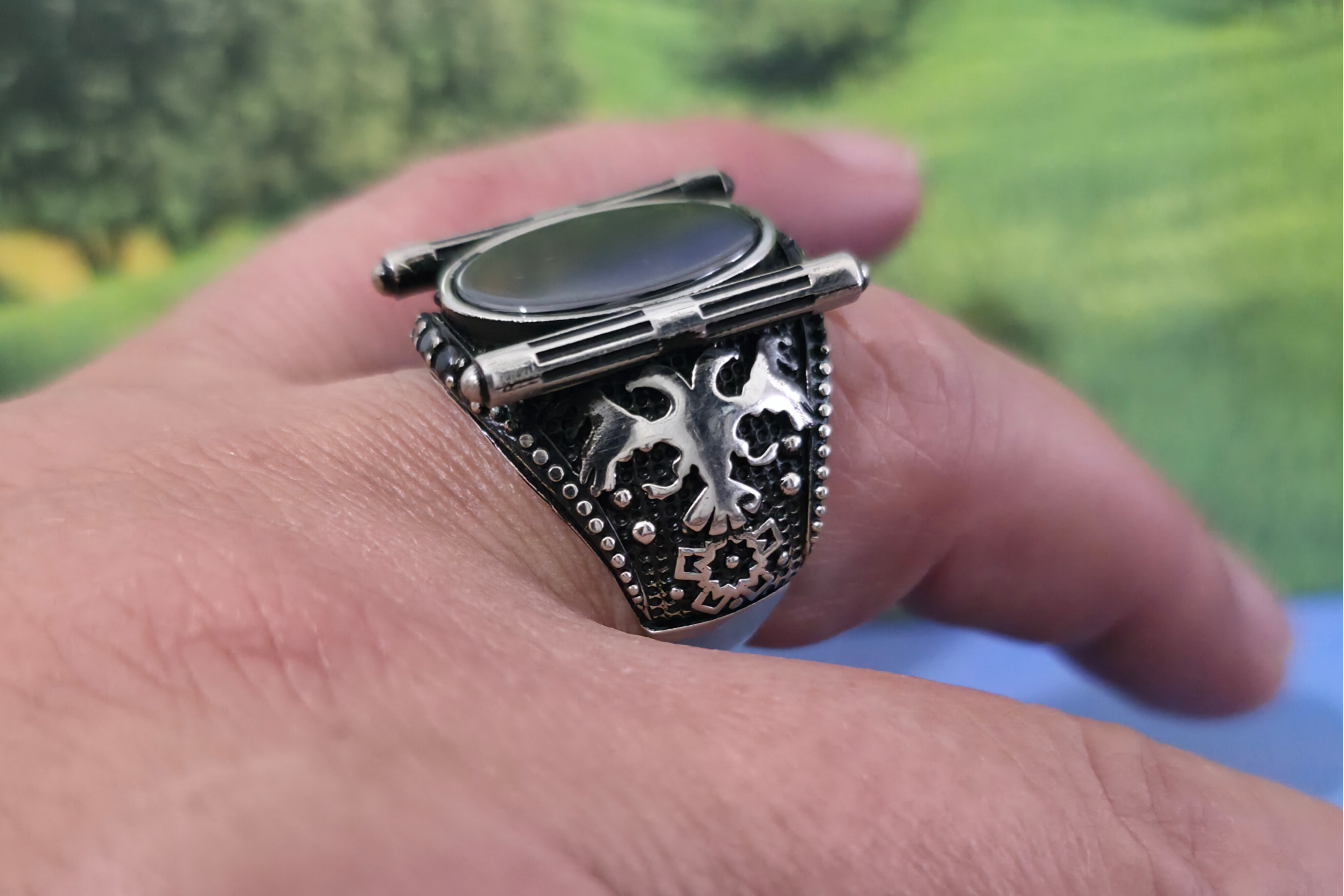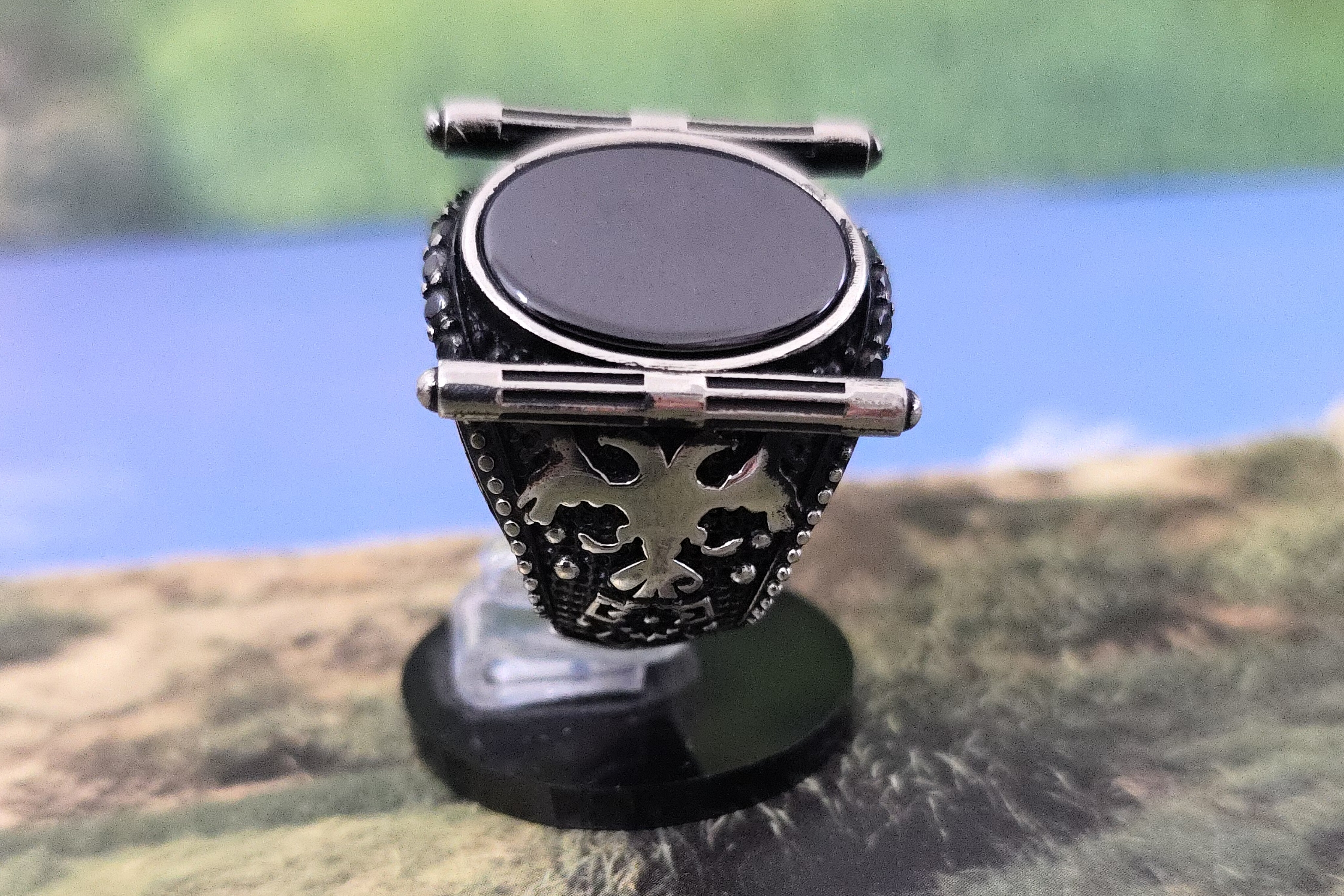 انگشتر نقره مردانه با نگین مشکی وزن ۱۹ گرم و ۳۰۰ سوت سایز انگشتر ۶۴ الی ۶۵ متریال نقره عیار ۹۲۵ و نگین سنگ اونیکس مشکی